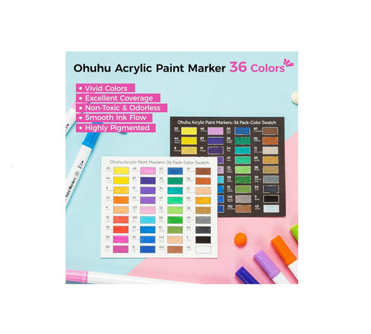Ohuhu Set 36 Markere Acrilice, Varf Dublu, Brush si Dots, Rezervor Din Bumbac, Vopsea Cu Opacitate Ridicată Pentru Pictat Pietre, Hartie, Ouă, Lemn, Sticlă, Ceramică Y30-80601-75
