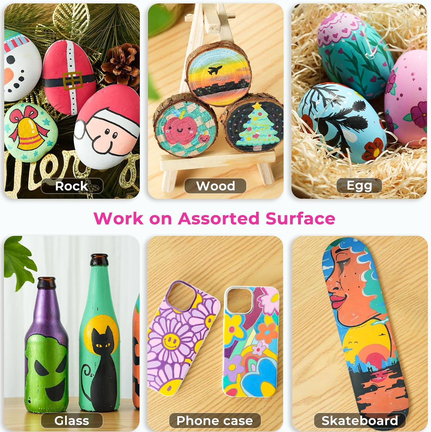 FUNCȚIONEAZĂ PE DIVERSE SUPRAFEȚE: Dezlănțuie-ți creativitatea cu stilourile Ohuhu cu vârf dublu pentru pictat pietre, format din 60 de bucăți! Aceste markere pot fi utilizate pe o gamă largă de suprafețe, inclusiv pietre, lemn, material textil, ceramică, căni, pahare, plastic, hârtie, ouă și pânză!