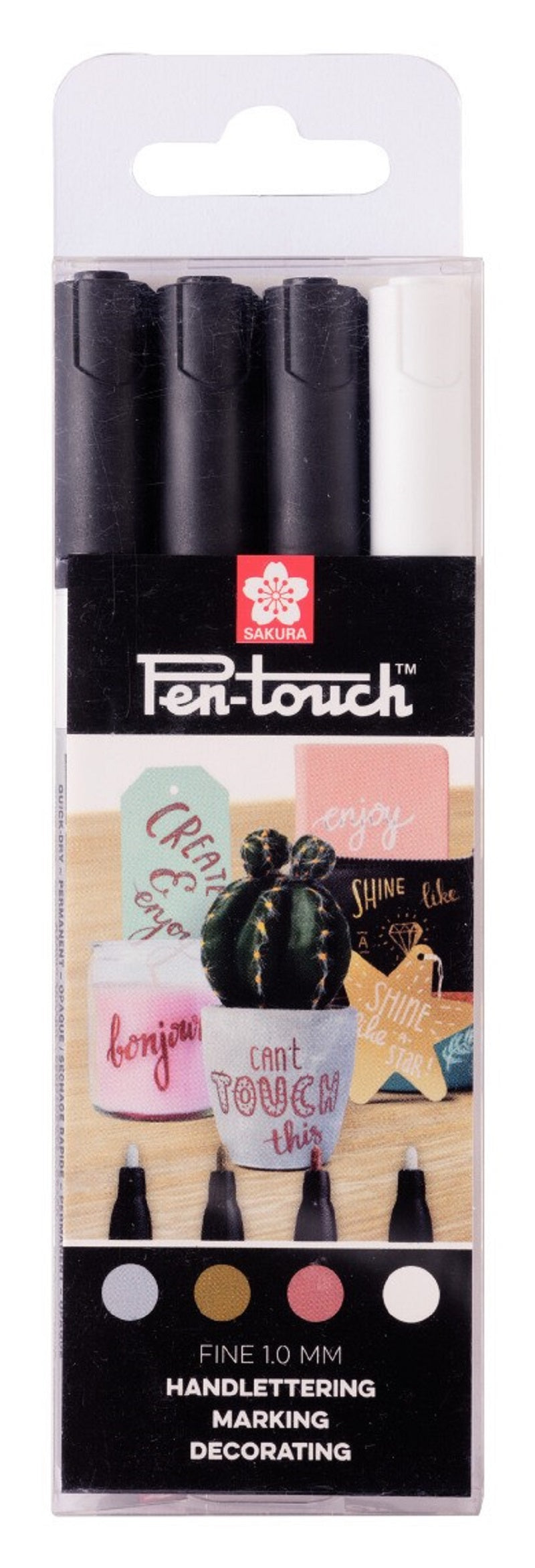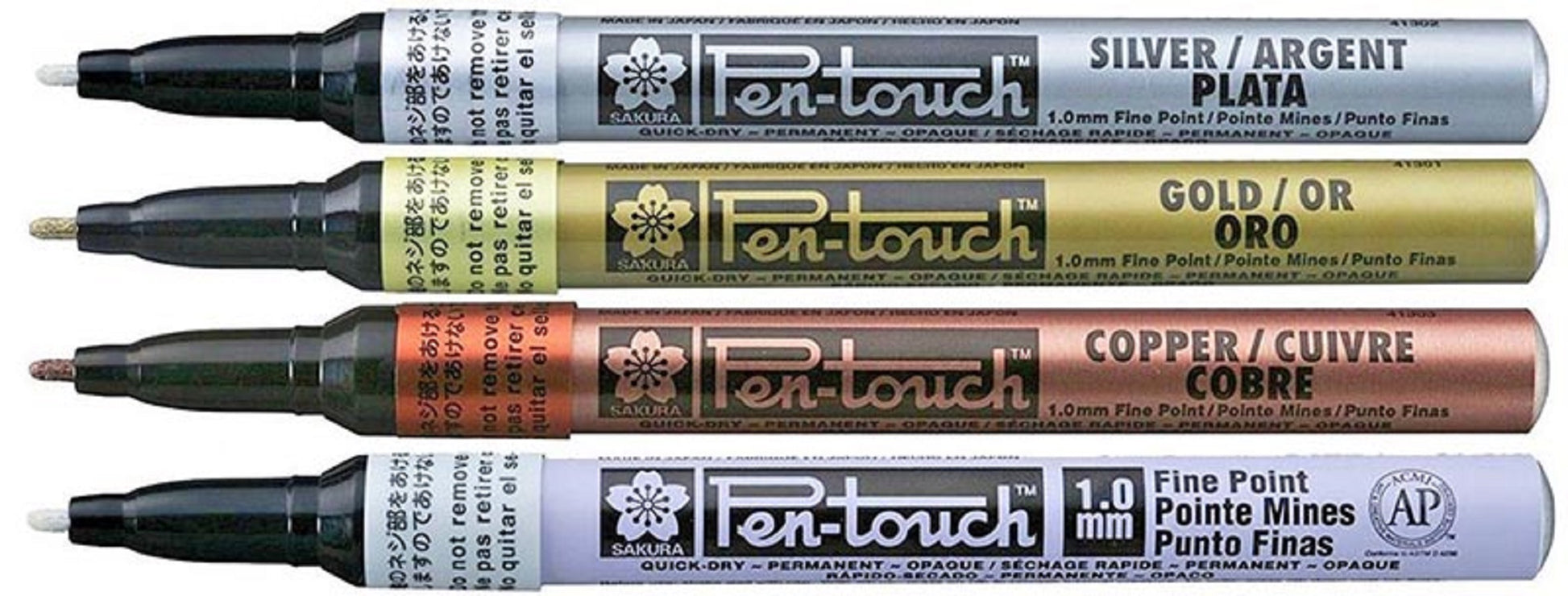 Setul de markere Sakura Pentouch Fine Metalic 4 contine 4 markere cu vopsea metalizata, culorile argint, aur, cupru si alb, rezistente pe suprafete netede. Aceste markere 4 se pot utiliza pe plastic, lemn, sticla, portelan, ceramica, cauciuc, piatra, metal si hartie.