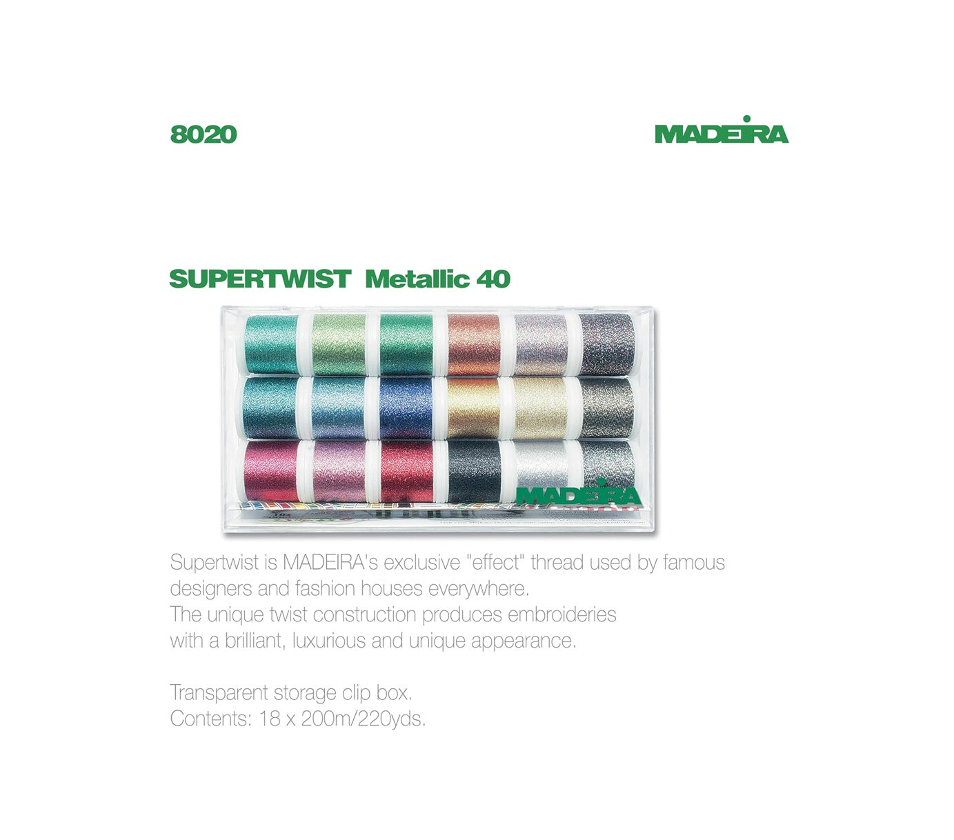Cel mai cunoscut fir metalizat pentru broderie fashion. Aspectul unic stralucitor se datoreaza unei constructii sofisticate de rasucire. Setul de 18 ate se vinde in cutia lui speciala din plastic. Este potrivita pentru masinile de brodat sau pentru masinile combinate de cusut si brodat.