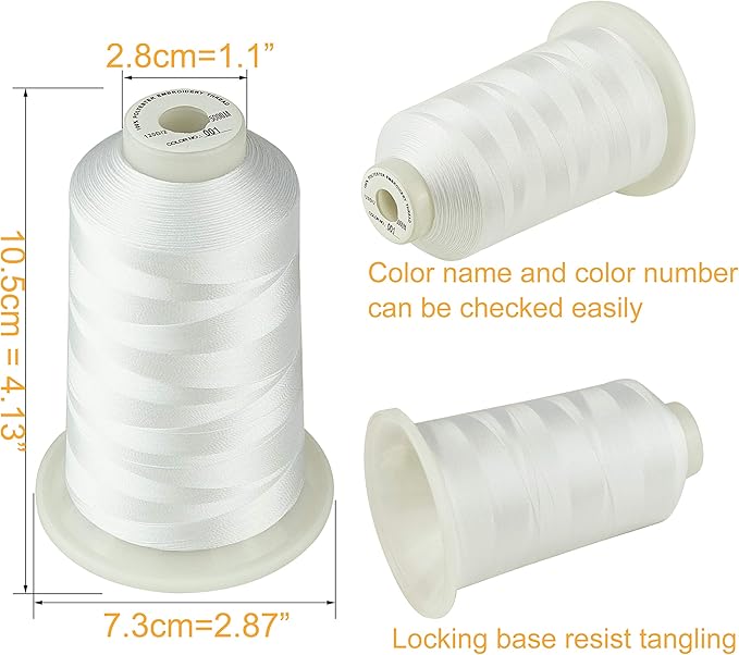 Design cu bază blocabilă a bobinei: Fiecare bobină 5000M dispune de baza noastră mare inovatoare cu blocare, concepută pentru a preveni căderea bobinei în timpul brodării și cusutului de mare viteză, asigurând o derulare lină și îngrijită a firului, fără a fi nevoie de accesorii suplimentare.